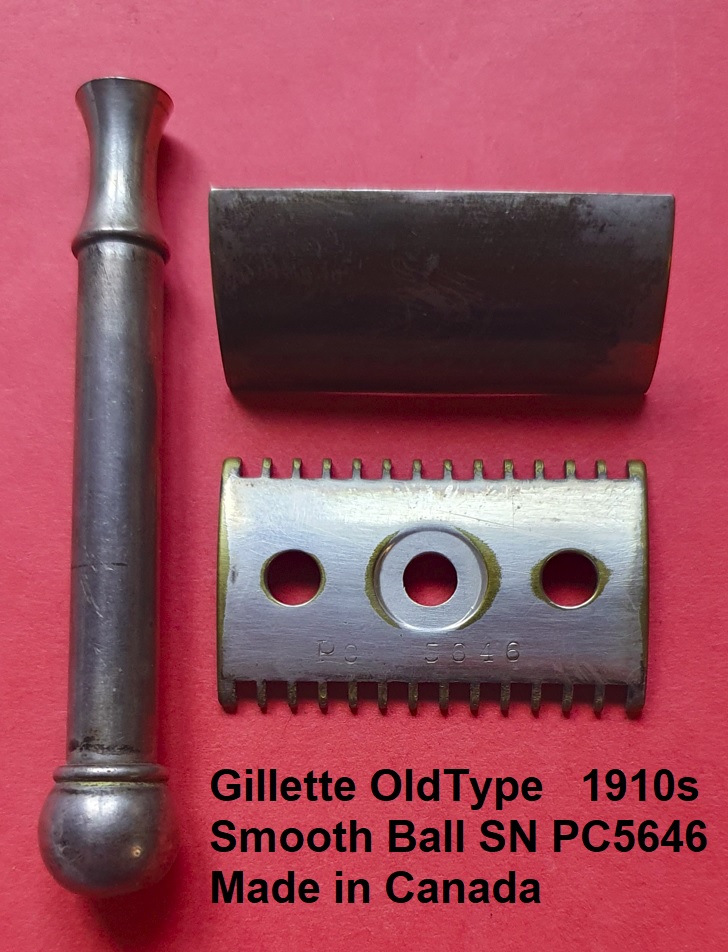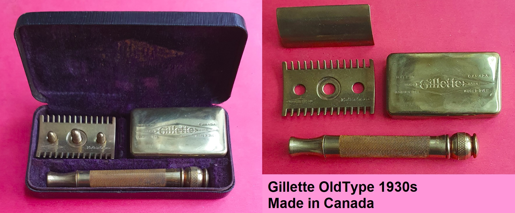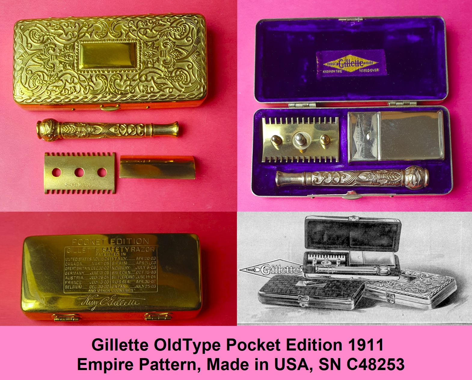 The Old Type series was introduced in 1903 as Gillette’s first safety razor design, launching the modern era of shaving. This model was produced into the early 1930s and established the double-edged (DE) blade system with disposable blades, a major innovation in shaving technology at the time.